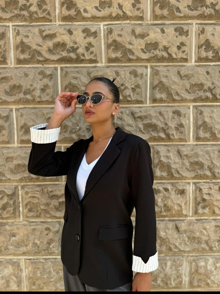 בלייזר שחור בגזרה נקייה ומדויקת, עם קיפולי שרוול פסים שמוסיפים טאץ’ אלגנטי וחכם. מתאים ללוק יומיומי מוקפד, לעבודה או לאאוטפיט ערב בעדינות של סטייל אירופאי.