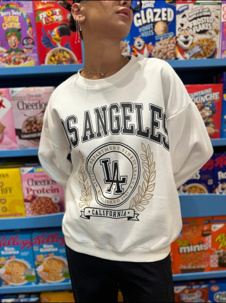 סווטשירט לבן עם פרינט קולג’ מקורי, לוק צעיר, נוח וסטייל אמריקאי קלאסי. מושלם לימי בסיס, יציאות זריזות וסטייל יומיומי בלי מאמץ.