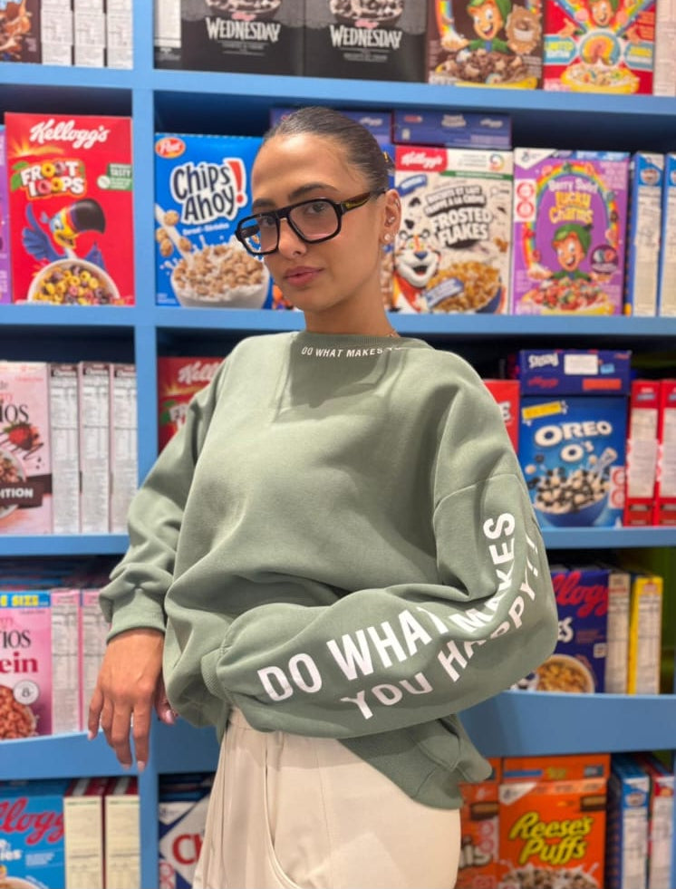 סווטשירט ירוק רך ומעוצב עם מסר חיובי בשרוול. גזרה נוחה, בד נעים ואווירה של סטייל נינוח ומודרני. מושלם ללוק קז’ואל עם אמירה.